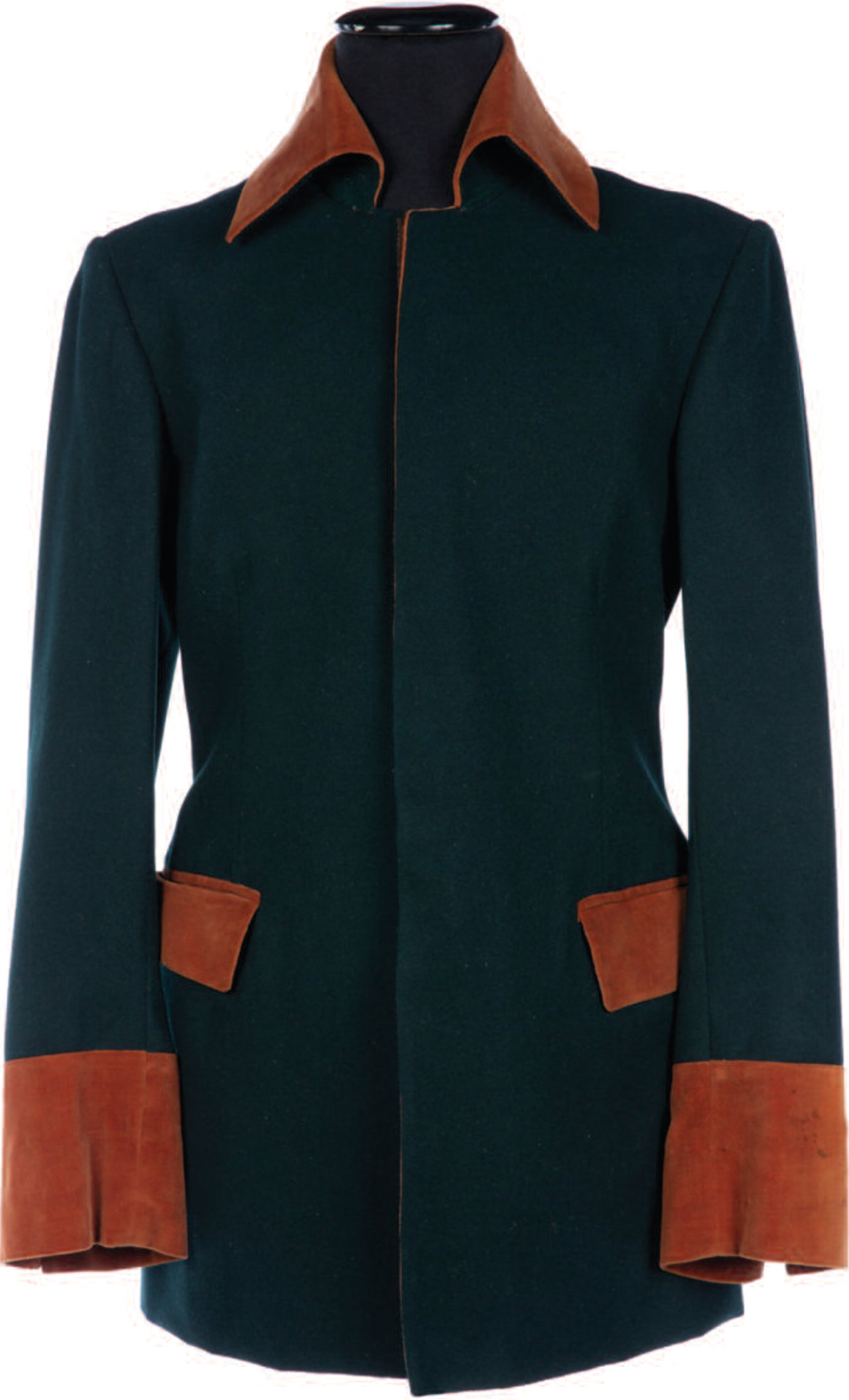 A black wool, tailored jacket with brown velvet pocket flaps, cuffs, collar and interior front placket, with Velcro front closure.