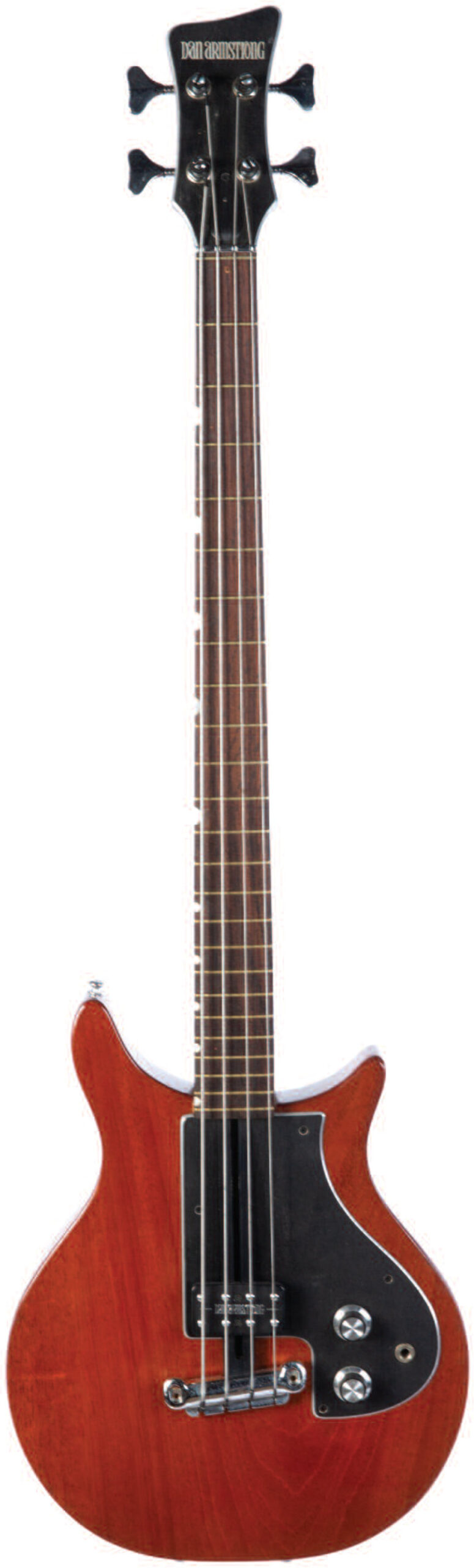 This prototype double-cutaway bass was built using a unique body shape quite unlike the later production models. The fingerboard has thumbnail inlays at the upper bass side of the fingerboard and is fitted with two-on-a-side Schaller tuners and the Dan Armstrong name on the headstock; production models also had “London” silkscreened on the headstock.