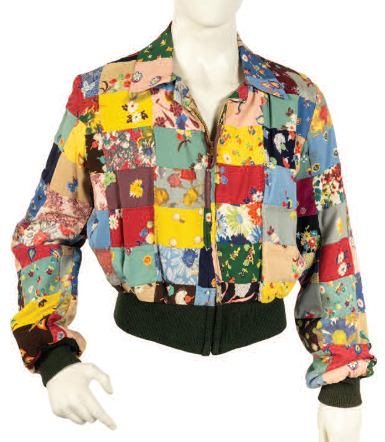 A silk patchwork jacket with zip front closure, green knit cuffs and waistband.